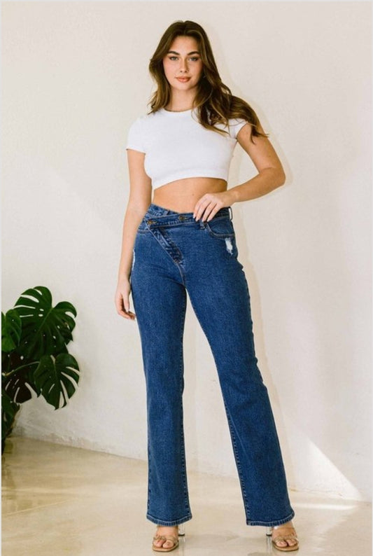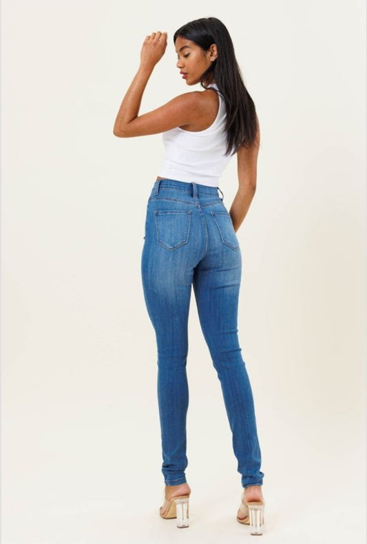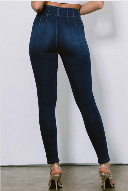 PANTALONES JEANS AZUL CLASICO VIBRANT CON BOTONES ROSE GOLD SKINY EP-1678